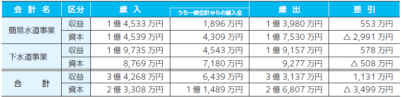 ※収益的収支に充てる企業債として簡易水道事業480万円、下水道事業210万円を上記に加え収入しています。