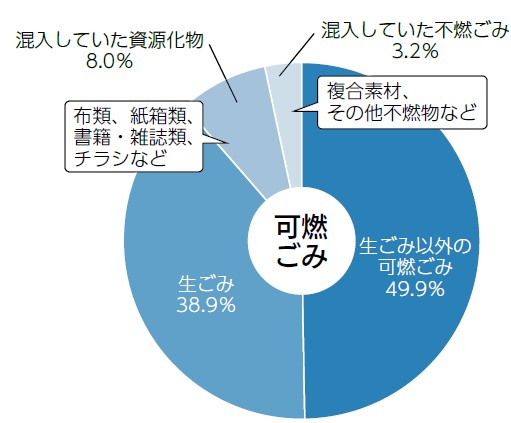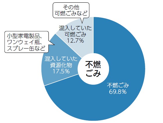 小型家電製品、スプレー缶、プラスチック資源など再利用できる「資源化物」が約17.5%、可燃ごみが約12.7%混入していました。