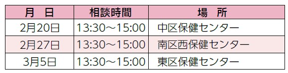 こころの健康(若年性認知症・アルコール関連問題を含む)について専門医が相談に応じます(要予約)。申し込みは各保健センターへ。