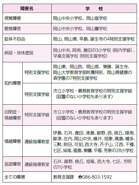 障害のある子どもが、十分な教育を受けられる学校に入学できるよう、下表の機関で相談に応じます。小学校・義務教育学校特別支援学級や特別支援学校(小学部)では、子どもの障害の状態に応じて専門的な教育を行います。在宅の子どもには、個別の状況に応じて対応します。詳細は、下表の相談窓口までお問い合わせください。