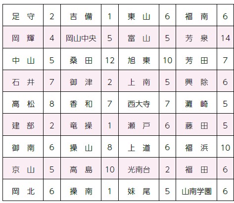 北区:足守、中山、御南、蛍明、野谷、牧石、鯉山、岡南、石井、清輝、大野、福渡、竹枝、加茂、馬屋上、御野、平津、吉備、桃丘、陵南、御津、庄内、横井