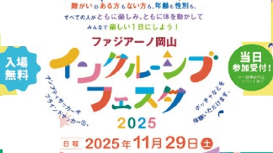 障がいのある人、ない人、年齢や性別などにかかわらず、全ての人がともに楽しみ、ともに体を動かすイベント「ファジアーノ岡山インクルーシブフェスタ2025」を11月29日(土)に岡山ドームで開催します。初めて開催した昨年は、多くの皆さんにご来場いただき笑顔あふれるハートフルな活動となりました。