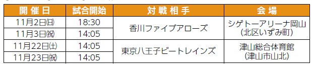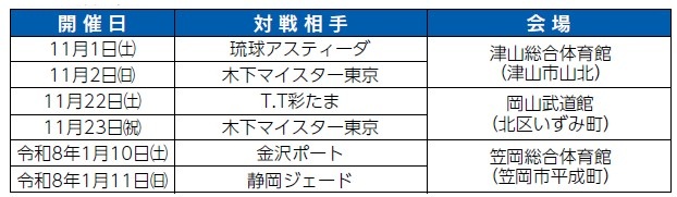 10月のホーム2節を終えシーズンのスタートを切りました。11月はシゲトーアリーナ岡山での開催節があります!2025-26シーズンも青色で会場を染めて勇敢に戦う選手へのご声援をお願いします!