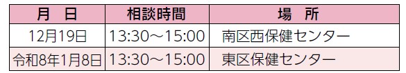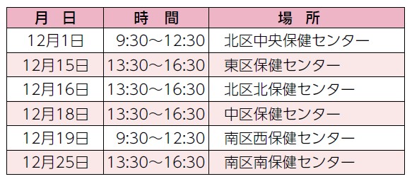 こころの健康(若年性認知症・アルコール関連問題を含む)について専門医が相談に応じます(要予約)。申し込みは各保健センターへ。