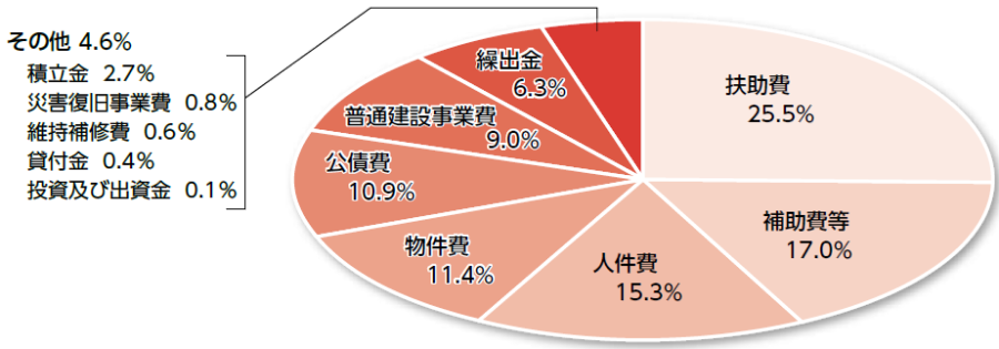 人件費:80億4,611万円(+5億1,999万円)…職員や特別職の給与、議員・各種委員の報酬など