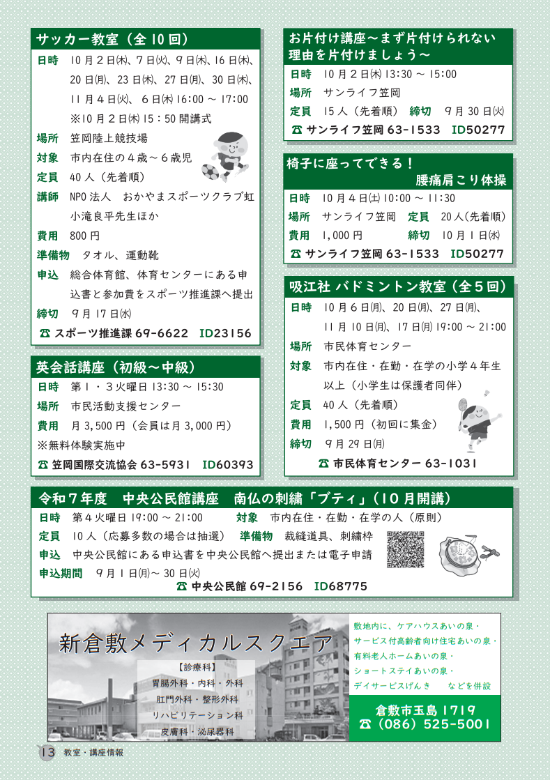 講座 広報かさおか 2025年9月号 13面 13/20 前の記事 次の記事 発行日 : 2025年09月01日 自治体名 : 岡山県笠岡市 広報紙名 : 広報かさおか 2025年9月号 Tweet シェアする 広報かさおか 2025年9月号 12面 広報かさおか 2025年9月号 14面