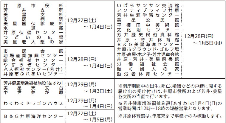 閉庁時の連絡先市役所(【電話】62-9555)、芳井支所(【電話】72-0111)、美星支所(【電話】87-3111)