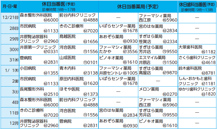 健康 休日当番医(予定)/休日当番薬局(予定)/休日歯科当番医(予定) 43/47 前の記事 次の記事 発行日 : 2025年12月15日 自治体名 : 岡山県井原市 広報紙名 : 広報いばら 2025年12月号 ※都合により当番に変更がある場合がありますので、事前に電話などで確認してください。 Tweet シェアする くらしのカレンダー 井原市ひとづくり実行委員会より ふるさと井原の未来をつくるひとづくり
