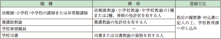 幼稚園・小学校・中学校で、臨時職員が必要となった場合に、あらかじめ登録した人の中から選考し、採用する制度を設けています。