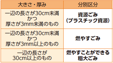 変更後:新しい分別区分は、大きさ・厚みに応じて、下の表のとおりとなります。