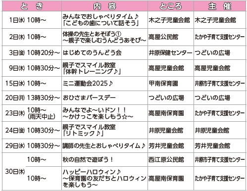 ■10月こそだてカレンダー ※事前に予約が必要です。