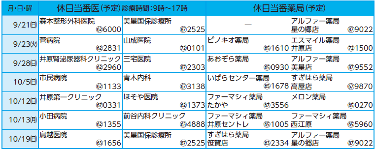 健康 休日当番医(予定)/休日当番薬局(予定) 46/50 前の記事 次の記事 発行日 : 2025年09月15日 自治体名 : 岡山県井原市 広報紙名 : 広報いばら 2025年9月号 ※都合により当番に変更がある場合がありますので、事前に電話などで確認してください。 Tweet シェアする くらしのカレンダー 星から宇宙へ