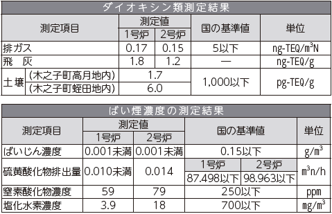 採取日:(土壌)5月26日、(1号炉排ガス)7月17日、(1号炉飛灰)7月17日、(2号炉排ガス)5月16日、(2号炉飛灰)5月16日