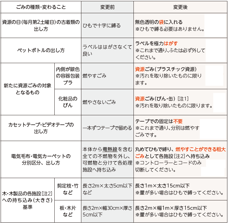 ☑製品プラスチック(プラスチック素材100%のもの)は、大きさ・厚みに応じた分別に変わります。変更後は「資源ごみ」「燃やすごみ」「燃やすことができる粗大ごみ」のいずれかになります。