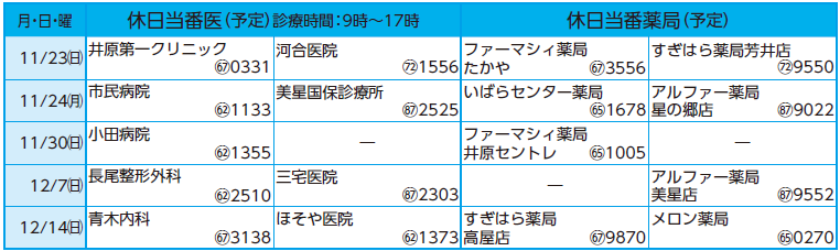 健康 休日当番医(予定)/休日当番薬局(予定) 38/42 前の記事 次の記事 発行日 : 2025年11月15日 自治体名 : 岡山県井原市 広報紙名 : 広報いばら 2025年11月号 ※都合により当番に変更がある場合がありますので、事前に電話などで確認してください。 Tweet シェアする くらしのカレンダー 星から宇宙へ