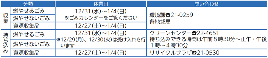 注意事項:休業期間中、斎場使用の予約や戸籍の届け出は本庁にて宿日直が受け付けます。