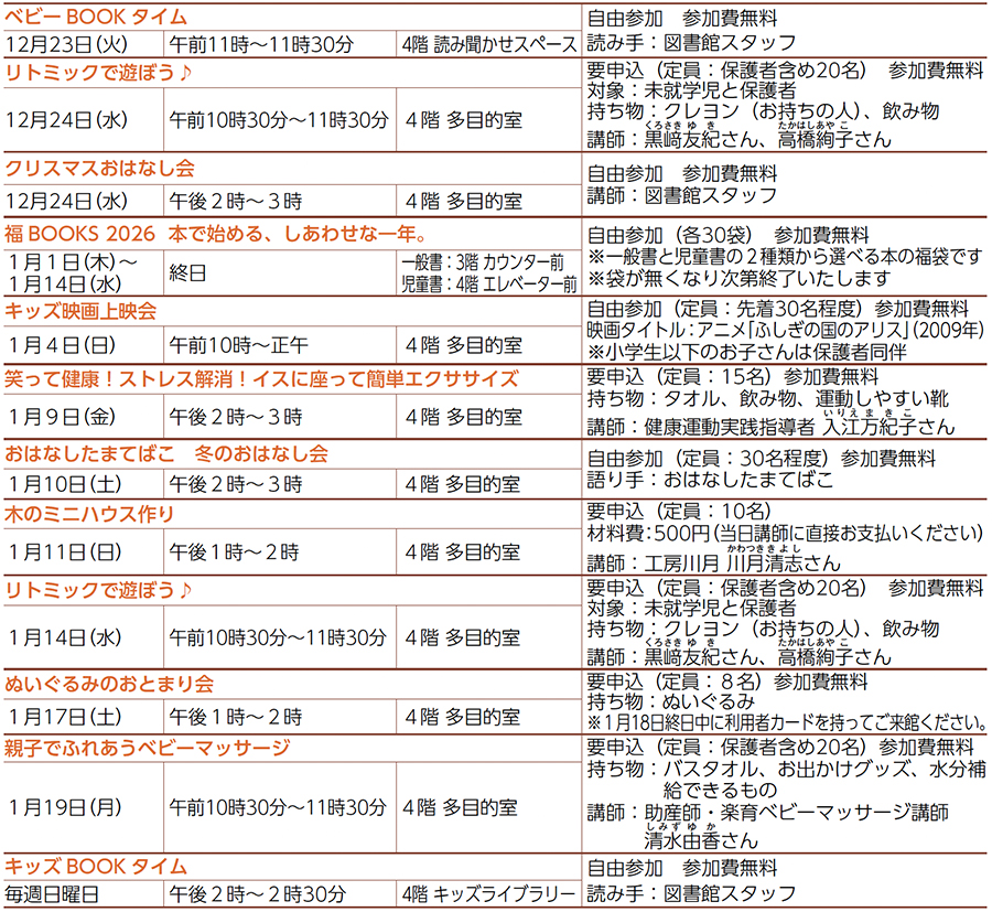 イベントの申し込みは高梁市図書館ウェブサイトで電子申請をしてください。受け付け開始日は前月20日です。