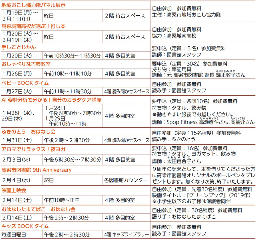 イベントの申し込みは高梁市図書館ウェブサイトで電子申請をしてください。受け付け開始日は前月20日です。