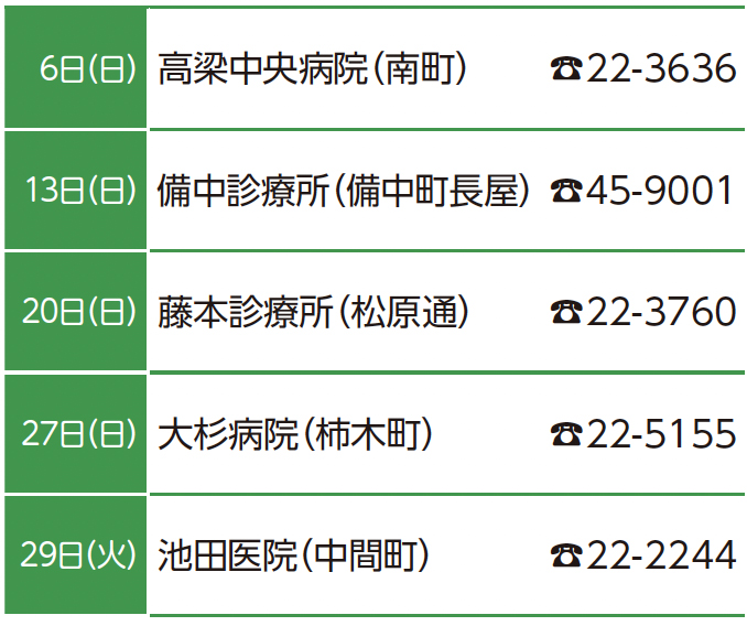 くらし 休日当番医(4月) 20/27 前の記事 次の記事 発行日 : 2025年03月15日 自治体名 : 岡山県高梁市 広報紙名 : 広報たかはし 2025年3月号(245号) ※診療時間は午前9時~午後5時です。受診前に必ず電話で症状をお知らせください。 また、受診の際はマスクを着用してください。 ※休日当番医は、随時変更となる場合がありますので、最新の情報は市ウェブサイトからご確認ください。 Tweet シェアする 子育て 求人情報