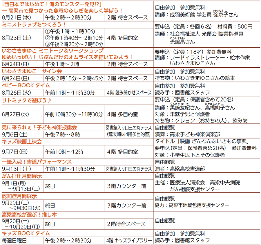 イベントの申し込みは高梁市図書館ウェブサイトで電子申請をしてください。受け付け開始日は前月20日です。