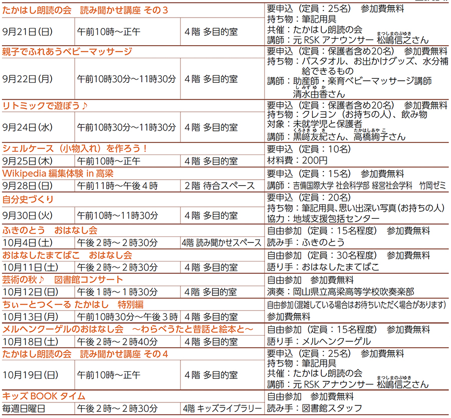 イベントの申し込みは高梁市図書館ウェブサイトで電子申請をしてください。受け付け開始日は前月20日です。