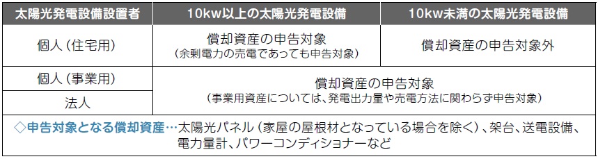 太陽光発電設備は償却資産に該当し、申告の対象となる場合があります。表を参考に、所有している太陽光発電設備の設置状況を確認してください。