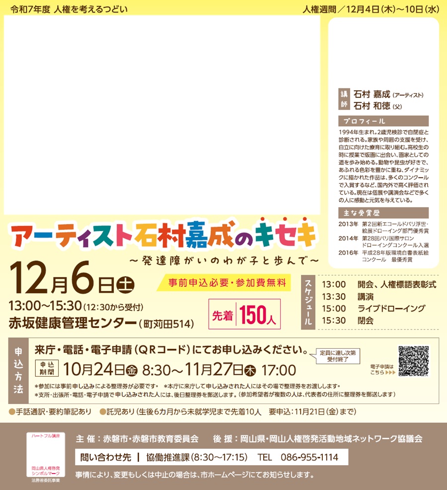 イベント 令和7年度 人権を考えるつどい アーティスト石村嘉成のキセキ~発達障がいのわが子と歩んで~ 26/27 前の記事 次の記事 記事を読み上げる 発行日 : 2025年11月01日 自治体名 : 岡山県赤磐市 広報紙名 : 広報あかいわ 令和7年11月号 Tweet シェアする 今月の表紙・編集者のつぶやき その他のお知らせ(広報あかいわ 令和7年11月号)
