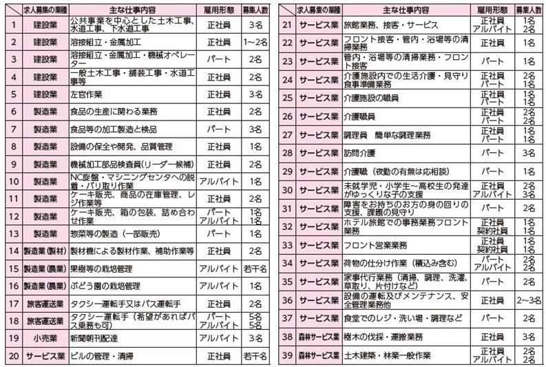 商工会には、地区内の以下業種の事業者より求人募集の情報が集まっております。