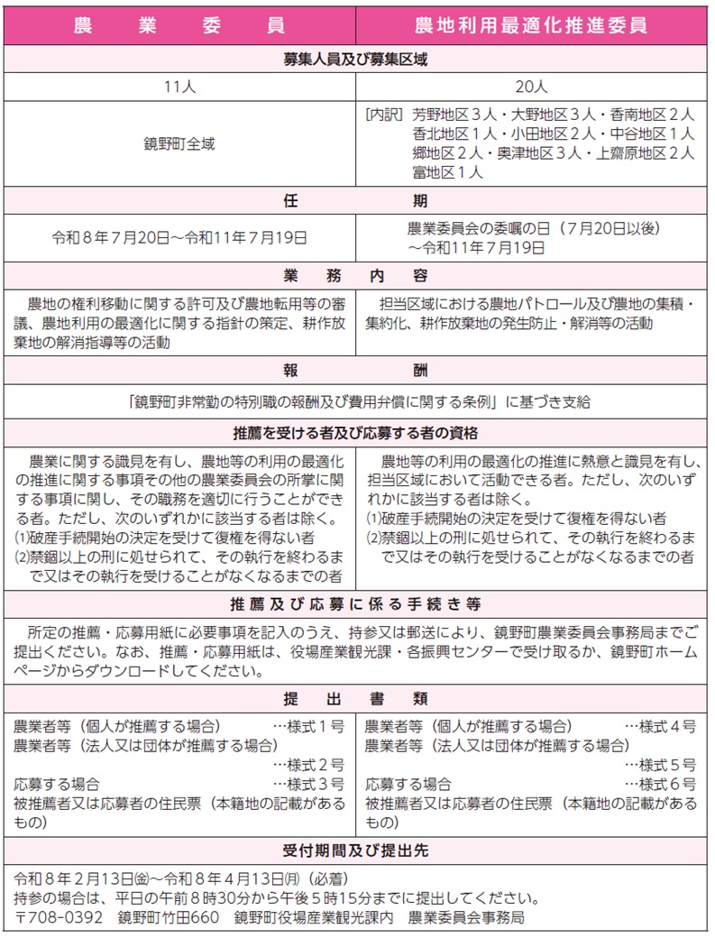 令和8年7月19日の任期満了に伴い、農業委員、農地利用最適化推進委員の募集をします。応募資格など、詳しくは町ホームページをご覧ください。