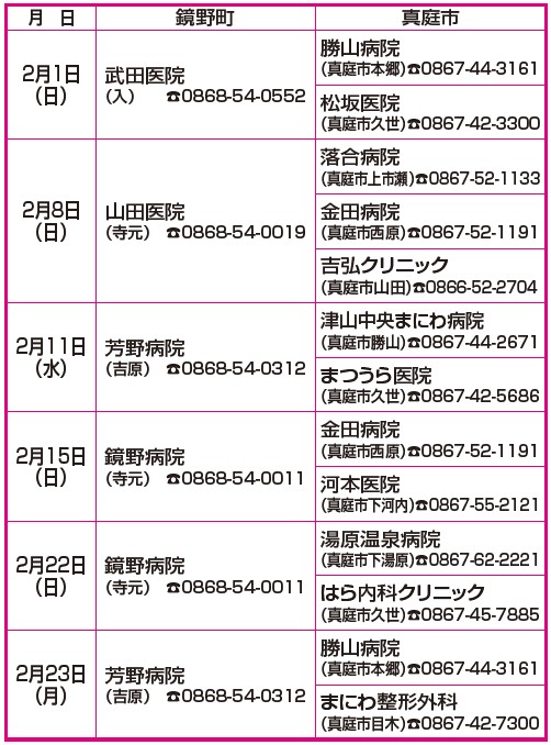 くらし 2月の休日当番医 38/45 前の記事 次の記事 記事を読み上げる 発行日 : 2026年02月01日 自治体名 : 岡山県鏡野町 広報紙名 : 広報かがみの 2026年2月号 診察時間:午前9時~午後5時 ・急患のみが対象。原則として往診は出来ません。 ・当番医が変更することがありますので、事前に電話等で確認してください。 Tweet シェアする し尿の収集 納税ごよみ 2月
