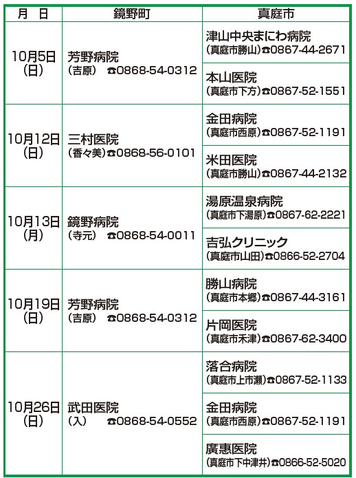 くらし 10月の休日当番医 34/41 前の記事 次の記事 記事を読み上げる 発行日 : 2025年10月01日 自治体名 : 岡山県鏡野町 広報紙名 : 広報かがみの 2025年10月号 診察時間:午前9時~午後5時 ・急患のみが対象。原則として往診は出来ません。 ・当番医が変更することがありますので、事前に電話等で確認してください。 Tweet シェアする し尿の収集 納税ごよみ 10月