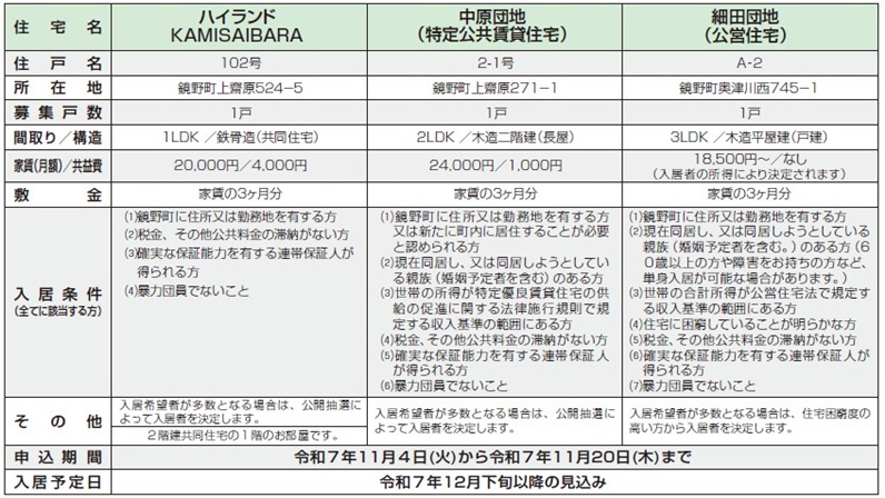 くらし 町営住宅入居者募集 23/47 前の記事 次の記事 記事を読み上げる 発行日 : 2025年11月01日 自治体名 : 岡山県鏡野町 広報紙名 : 広報かがみの 2025年11月号 町営住宅の入居者を募集しています。 入居を希望される方は、申込期間内にお申込みください。 申込・お問い合せ先:鏡野町建設課 住宅係 担当:西村 【電話】0868-54‒2989 Tweet シェアする 鏡野町内でお仕事を探している皆様へ! 図書館だより 11月号