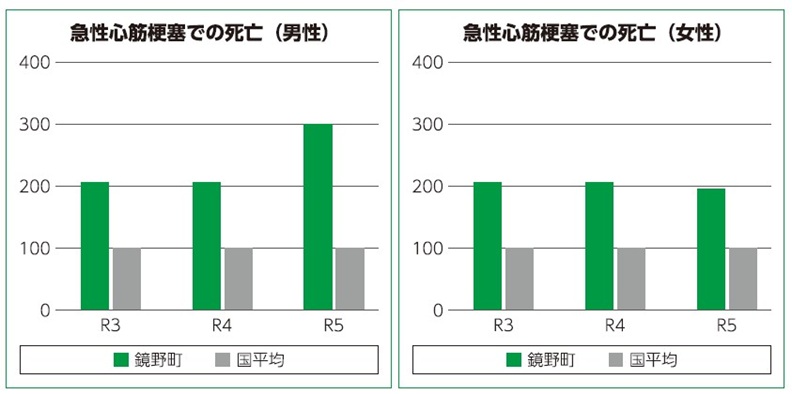 全国平均を100として死亡率(SMR)をみると男女とも鏡野町が高くなっています。心筋梗塞や脳梗塞などの血管系の病気は、血圧、血糖、コレステロール等の異常を放置することで発症しやすくなります。