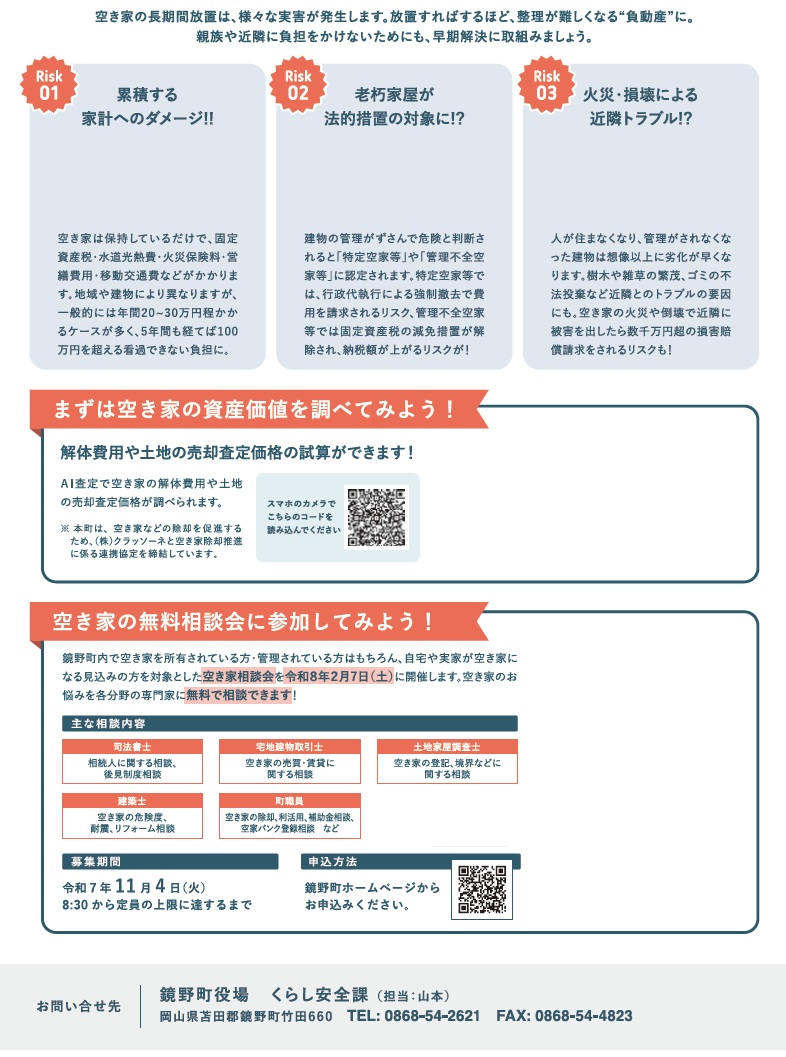 くらし 空き家の放置がもたらす3つのリスク 1/42 次の記事 記事を読み上げる 発行日 : 2025年12月01日 自治体名 : 岡山県鏡野町 広報紙名 : 広報かがみの 2025年12月号 Tweet シェアする 除雪作業へのご協力とお願い