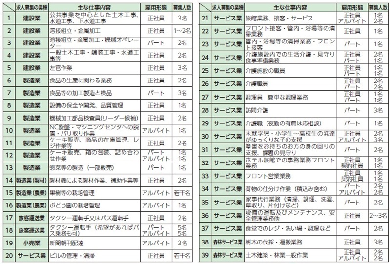 商工会には、地区内の以下業種の事業者より求人募集の情報が集まっております。