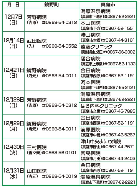 くらし 12月の休日当番医 35/42 前の記事 次の記事 記事を読み上げる 発行日 : 2025年12月01日 自治体名 : 岡山県鏡野町 広報紙名 : 広報かがみの 2025年12月号 診察時間:午前9時~午後5時 ・急患のみが対象。原則として往診は出来ません。 ・当番医が変更することがありますので、事前に電話等で確認してください。 Tweet シェアする し尿の収集 納税ごよみ 12月
