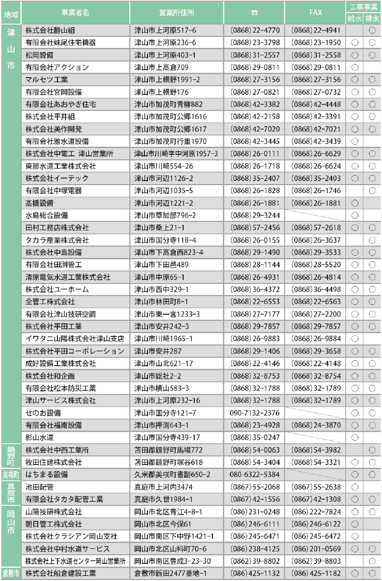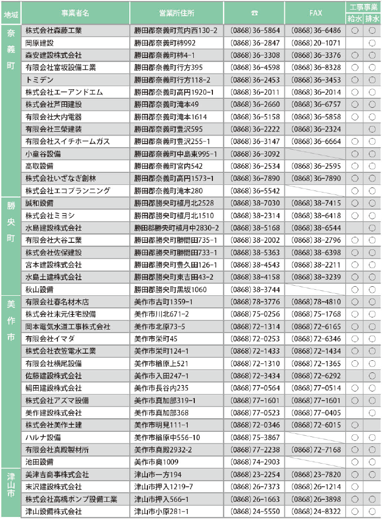 くらし お知らせ(3) 21/42 前の記事 次の記事 発行日 : 2025年12月01日 自治体名 : 岡山県奈義町 広報紙名 : 広報NAGI 2025年12月号(829号) ■指定給水装置工事事業者・排水設備指定工事店 一覧 (令和7年11月1日現在) 問合せ:地域整備課 【電話】36-4115 Tweet シェアする お知らせ(2) お知らせ(4)