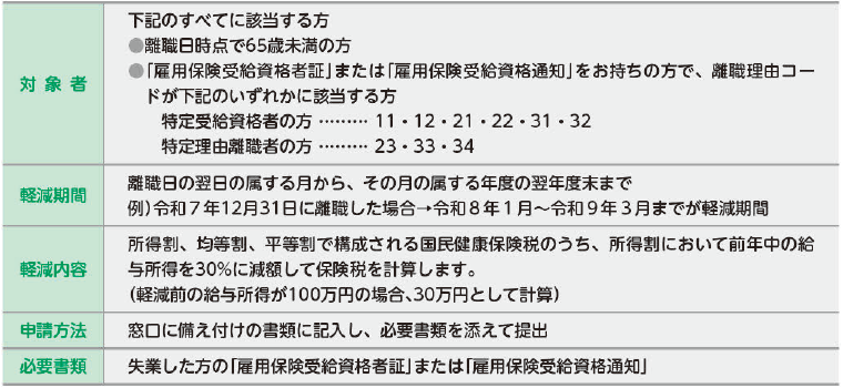 解雇や倒産などで離職し、国民健康保険に加入した方(非自発的失業者)は、国民健康保険税が軽減される制度があります。