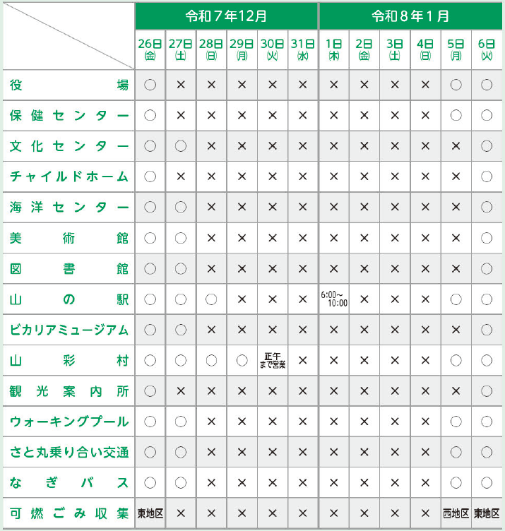 くらし 年末年始休業情報 28/42 前の記事 次の記事 発行日 : 2025年12月01日 自治体名 : 岡山県奈義町 広報紙名 : 広報NAGI 2025年12月号(829号) 12月26日(金)~令和8年1月6日(火) 問合せ:総務課 【電話】36-4111 Tweet シェアする お知らせ(6) Child News 子どもだより