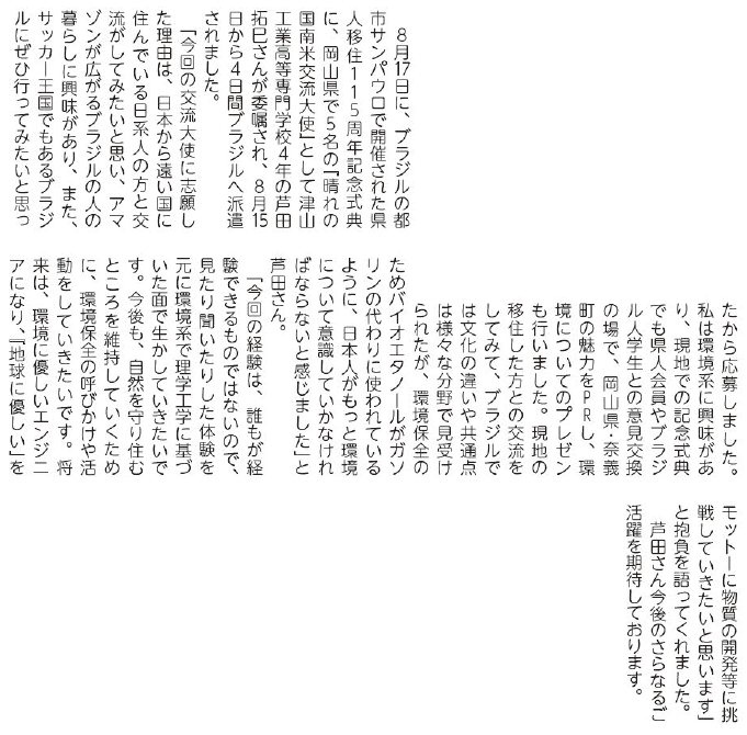 子育て 子育て応援宣言のまち 子育てするなら奈義町で Vol.87 38/42 前の記事 次の記事 発行日 : 2025年12月01日 自治体名 : 岡山県奈義町 広報紙名 : 広報NAGI 2025年12月号(829号) がんばる子どもたちをみんなで応援しましょう! ■ブラジル県人移住115周年 芦田拓巳(あしだたくみ)さん(高円) 『晴れの国南米交流大使』として委嘱 Tweet シェアする [消防・防災]年末に向けた火災予防について 編集後記