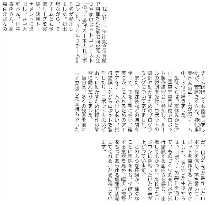 子育て 子育て応援宣言のまち 子育てするなら奈義町で Vol.88 32/36 前の記事 次の記事 発行日 : 2026年01月01日 自治体名 : 岡山県奈義町 広報紙名 : 広報NAGI 2026年1月号(830号) がんばる子どもたちをみんなで応援しましょう! ■奈義中学校生徒が快挙! 第30回記念大会 つやまロボットコンテスト Tweet シェアする [消防・防災]大雪時の道路交通確保の考え方が変わっています 編集後記