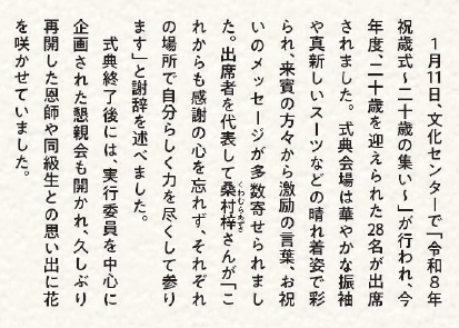 私は、本年を持ちまして、二十歳を迎え、大人としての階段を上り始めました。