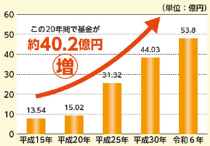 基金とは、簡単にいうと「まちの貯金」です。奈義町では、この20年間で基金を約40億2千万円増加させました。基金は、主に起債(借金)の償還の財源確保や公共施設の整備・大規模更新、地域振興・活性化に資する事業などに活用しています。