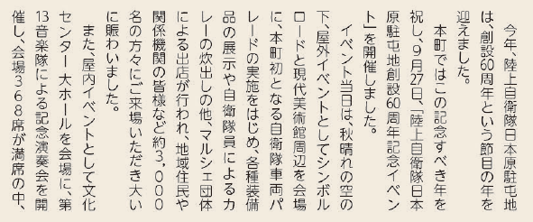 イベント 創設60周年 陸上自衛隊日本原駐屯地記念イベント開催 3/40 前の記事 次の記事 発行日 : 2025年11月01日 自治体名 : 岡山県奈義町 広報紙名 : 広報NAGI 2025年11月号(828号) Tweet シェアする アート de ミート Nagi 2025 なぎっ子の秋