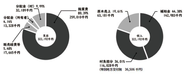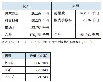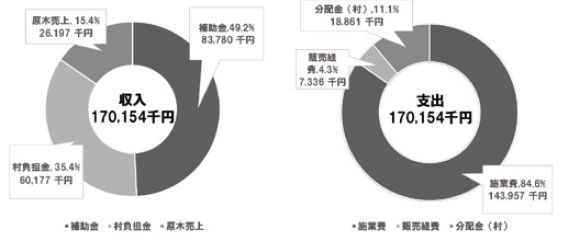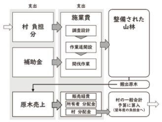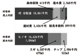 原木販売によって得たお金は、村と山林所有者に分けられ、村の収入分のうち、村有林と民有林それぞれで整備を行った分が村の財源となります。