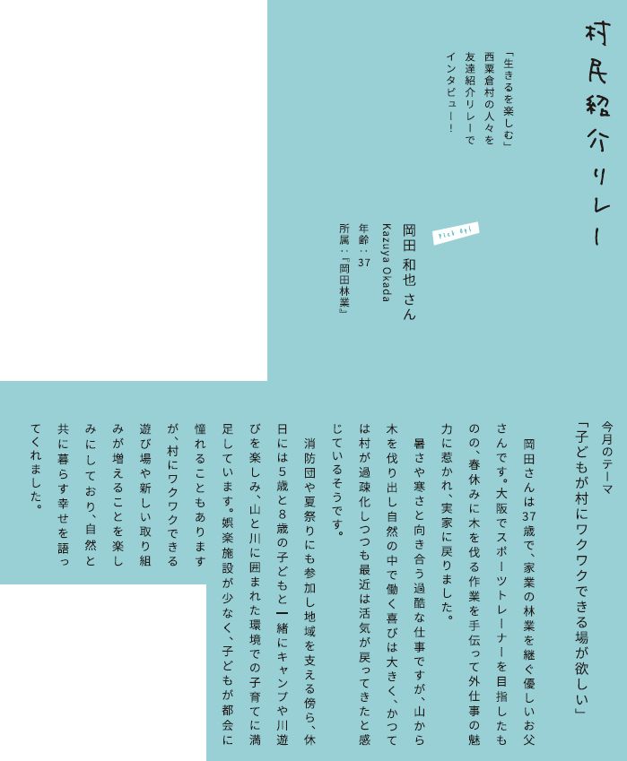 くらし 村民紹介リレー 27/28 前の記事 次の記事 発行日 : 2025年09月10日 自治体名 : 岡山県西粟倉村 広報紙名 : 広報にしあわくら 2025年9月号 Tweet シェアする あわくら百景 その他のお知らせ(広報にしあわくら 2025年9月号)