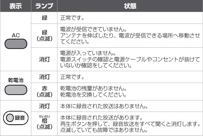 (2)機器前面の「ACランプ」が緑点灯、「乾電池ランプ」が消灯していることを確認する