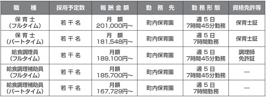 応募条件:地方公務員法第16条各号のいずれにも該当しない人で、保育士・給食調理員は有資格者であること。