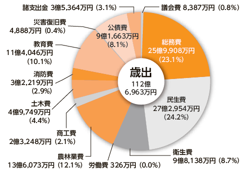 歳出決算額は、前年度より約5億9,182万円減の112億6,963万円となりました。