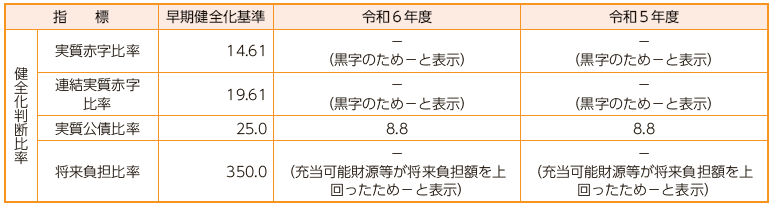 町では、財政状況を把握し明らかにするため、財政健全化法による財政健全化判断比率の指標を公表しています。令和6年度の財政状況は、いずれも国が定める基準を下回っています。